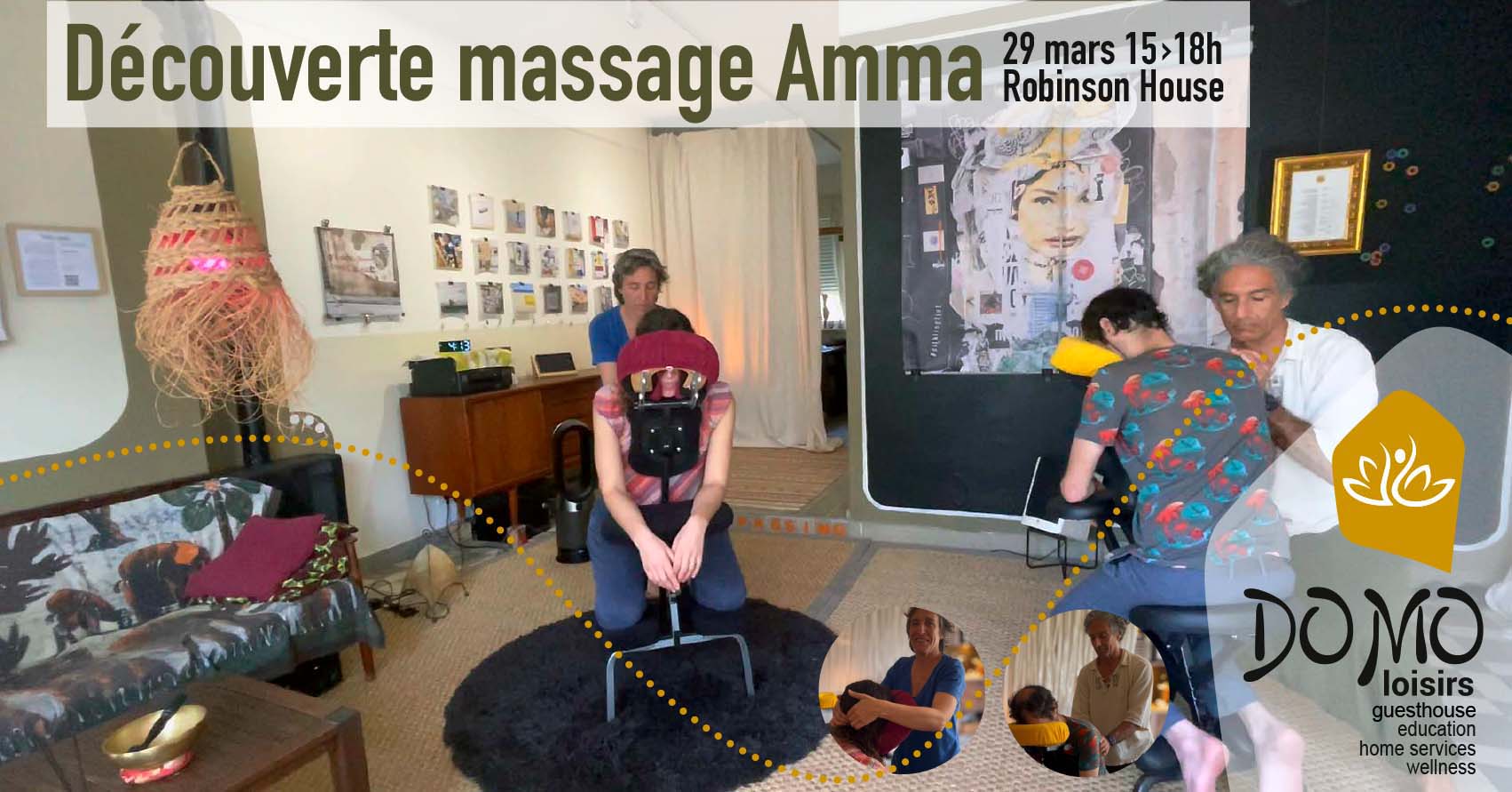 Une belle porte d’entrée dans l’univers du massage bien-être, avec après le massage, la possibilité de prolonger l’expérience en découvrant l’exposition d’appartement « Walls Speak ».
